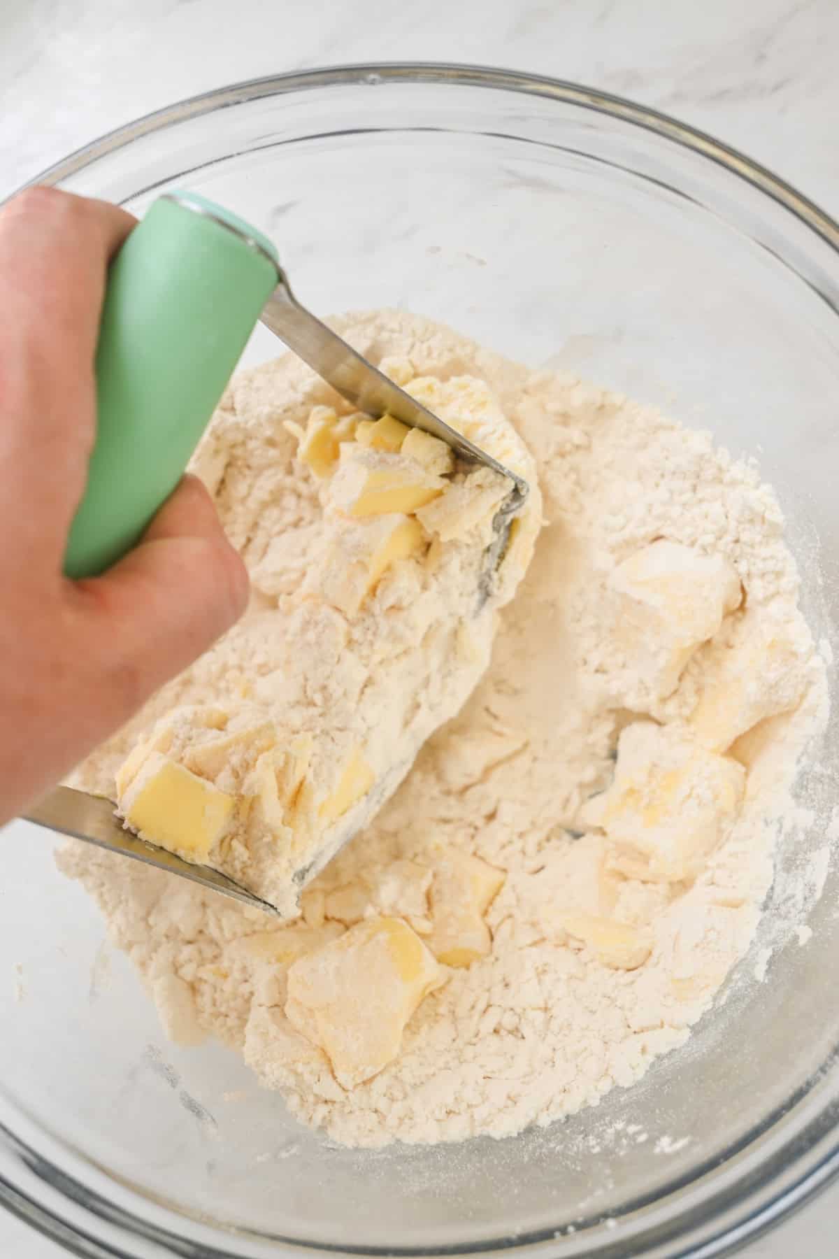 - Use a pastry cutter to roughly cut the butter into the flour, but not too small. A few small pieces are fine but the rest can be left in fairly large chunks. If the butter is melting at any point, place the bowl in the refrigerator.